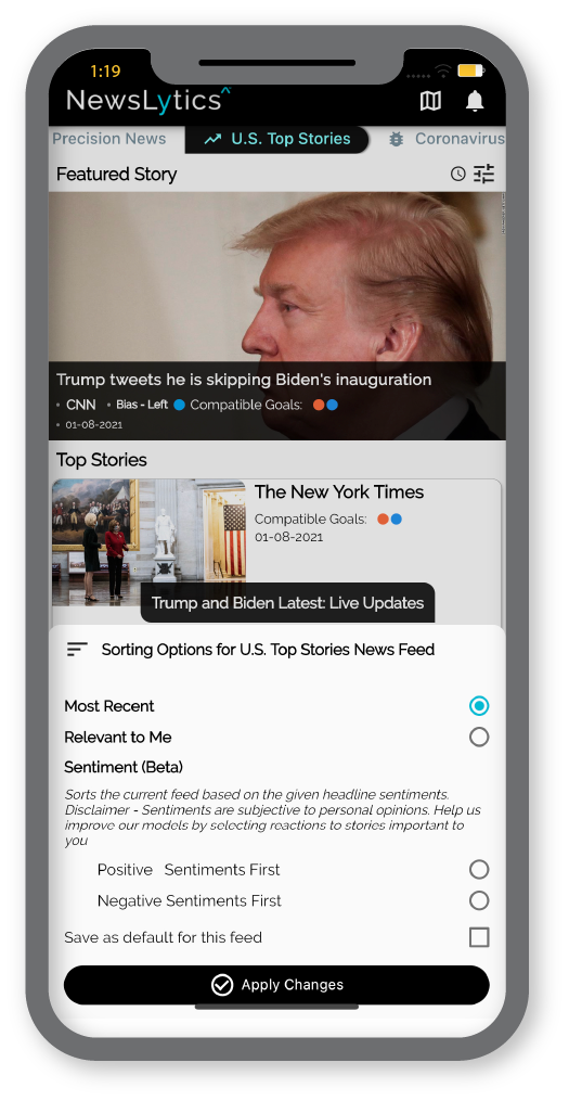 Yes, you can provide feedback in-app to help us improve the quality of our machine-learning models, and improve our accuracy. News Polarity is determined by many factors and may change over time based on the source's agenda. The information we provide to our users may be subject to change. We will notify you of any changes in-app.